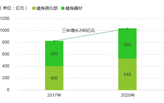 按照國際市場經驗,以日本健身俱樂部會員滲透率為參考值,若我國健身俱樂部會員滲透率達到3.1%,中國健身俱樂部的會員群體將會超過4000萬,按照人均年消費5000元估算,那么我國健身俱樂部所產生的市場規模將達到2000億元,而截止2017年,我國健身俱樂部的會員人數為800萬人,市場規模為400億元,按照目前的增長率計算,預計到2020年,會員人數將達到1080萬人,市場規模將達到540億元。