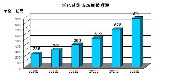 隨著消費者認知的提升以及各品牌渠道戰略的成熟,線上線下零售,房地產精裝修與校園將為市場注入新的增量,成為支撐新風市場規模持續增長的關鍵渠道;加之本次新型冠狀病毒的外力推動,相信在2020年,新風系統的行業應用和推廣將為新風市場注入活力,預計2020年新風系統市場規模將達到236億元。2021-2025年,若按照30%的年均復合增長率,則2025年新風系統行業市場規模將達到877億元,市場空間巨大。