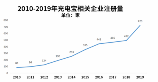 伴隨著智能手機產業的發展,近年來我國與“充電寶”相關的企業數量不斷增長。企查查數據顯示,目前我國在業存續的充電寶相關企業有3564 家。2010-2019年,我國充電寶相關的企業注冊量呈穩步增長趨勢。2015年開始企業增長速度開始加快,全年共注冊了355家企業,2016-2018年的注冊量均超過400,2019年注冊量達到720家,同比增長46.3%,是過去十年中最多的一年。