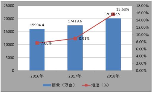 隨著城鎮(zhèn)化的不斷推進(jìn),城鎮(zhèn)人口快速增加,會促進(jìn)城鎮(zhèn)住宅銷量的增加,從而促進(jìn)空調(diào)銷量的增長。根據(jù)國家統(tǒng)計局相關(guān)數(shù)據(jù)統(tǒng)計顯示,2016-2018年中國空調(diào)行業(yè)整體產(chǎn)量規(guī)模分別為16049.3、17861.53、20486萬臺,同比增長分別達(dá)到2.55%、11.29%、14.69%;2016-2018年中國空調(diào)行業(yè)整體銷量規(guī)模分別為15994.4、17419.6、20142.5萬臺,同比增速分別達(dá)到7.66%、8.91%、15.63%。