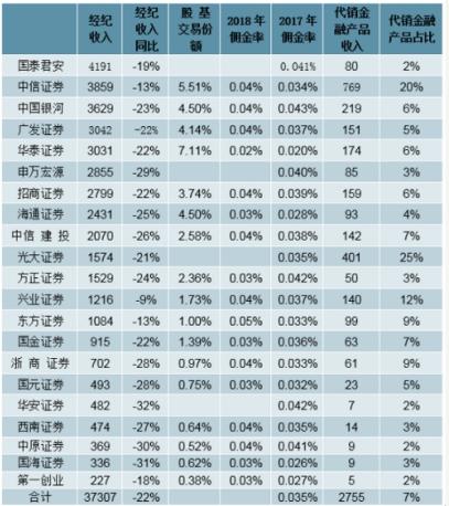 圖表:2018年上市券商經(jīng)紀(jì)業(yè)務(wù)收入及傭金率(百萬元)