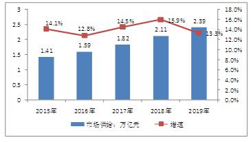 2019年中國科技服務業市場供給規模達到了2.39萬億元,市場供給規模同比增長大約13.3%。