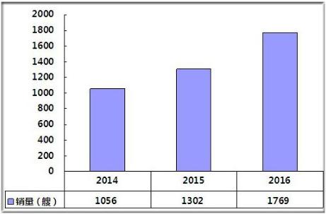 2014年中國國內(nèi)游艇銷量為1056艘,到2016年,達(dá)到1769艘。