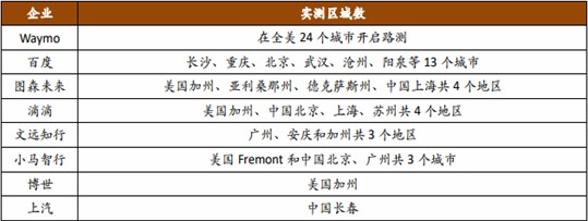 圖表:截止至2019年自動駕駛企業已公布累計實測區域個數