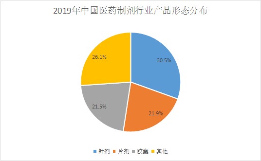 圖表:2019年中國(guó)醫(yī)藥制劑行業(yè)產(chǎn)品形態(tài)分布