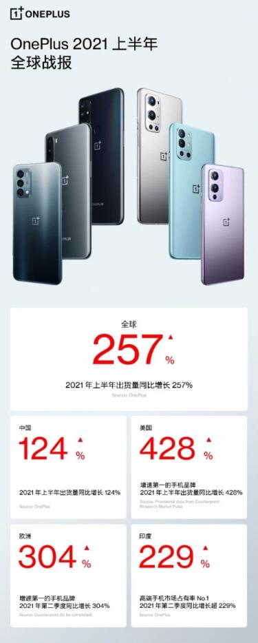 這些年國產手機正在不斷崛起,其中作為高端黑馬的,一加手機的全球市場份額也在不斷提升。7月29日,一加手機對外公布2021年上半年全球市場銷量增長數據。根據一加官方數據顯示,2021年上半年一加手機全球出貨量快速增長,同比漲幅高達257%。