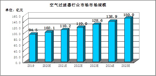 根據統計,2019年空氣過濾器行業市場規模達到為94.5億元,隨著空氣過濾器的應用范圍將進一步擴大,經濟結構的不斷轉型和對空氣質量要求的不斷提升,對空氣過濾器的需求會不斷釋放(以8%的增長率測算),預計2025年空氣過濾器行業市場規模會達到150億元。