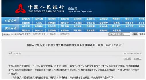 2021年10月13日,中國人民銀行官網發布《中國人民銀行關于加強支付受理終端及相關業務管理的通知(銀發〔2021〕259號)》,對銀行卡收單和條碼支付終端做出相應管理要求。