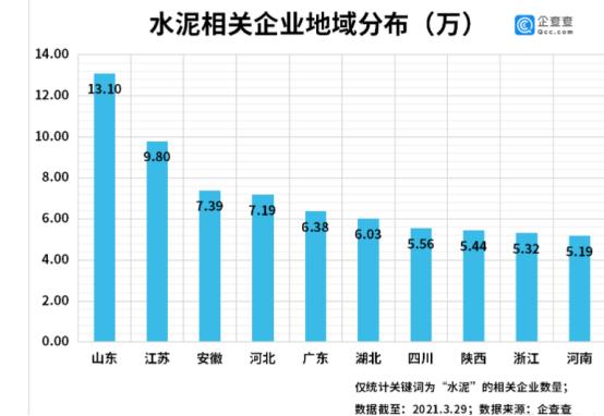 受需求帶動,近日浙江、江蘇、江西、福建、青海、甘肅等地水泥企業陸續發布漲價通知,A股水泥相關個股近期也集體走高。企查查數據顯示,目前我國共有127.19萬家水泥相關企業,山東省以13.1萬家企業高居第一,江蘇、安徽分列二三名,上海、天津、南寧則是排名前三的城市。2020年全年,水泥相關企業新注冊28.49萬家,同比增長42%,今年一季度新增企業7.49萬家,同比增長112%。