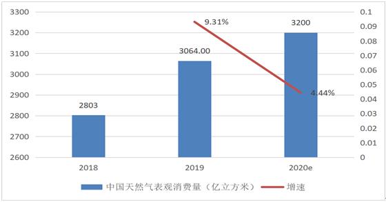 2018-2020年,中國天然氣表觀消費量為增加的趨勢,從2018年的2803億立方米增加到2020年的3200億立方米,年均復合增長率為6.85%。根據2019、2020年《中國天然氣發展報告》數據,2018-2020年中國天然氣表觀消費量如下圖所示: