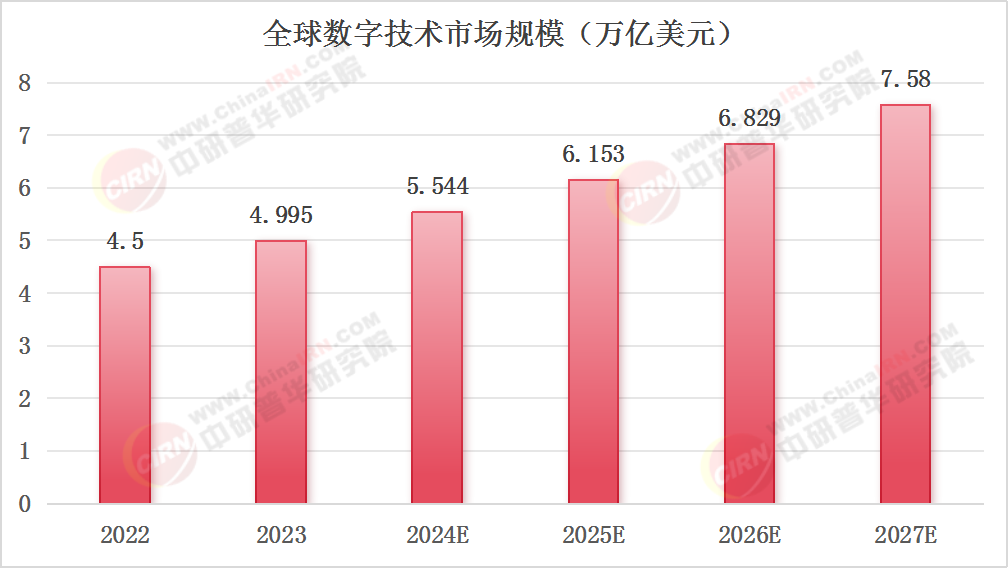 圖表:2022—2027年全球數字技術市場規模及預測