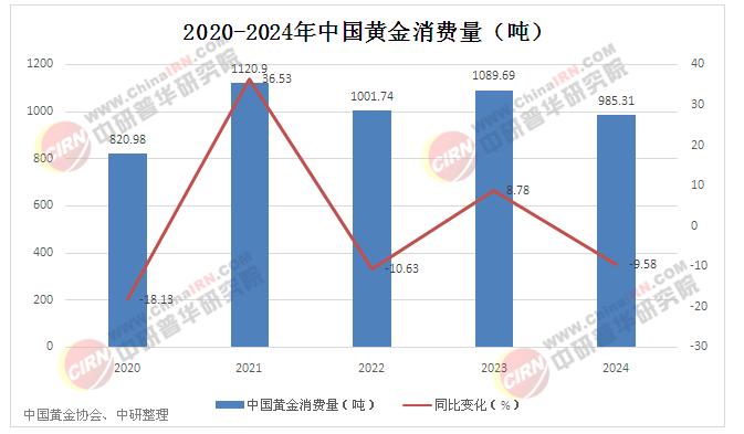 從中國黃金協(xié)會獲悉:2024年,我國黃金消費量985.31噸,同比下降9.58%。其中:黃金首飾532.02噸,同比下降24.69%;金條及金幣373.13噸,同比增長24.54%。