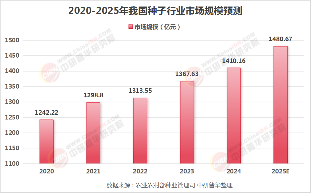 據中研普華產業研究院的《2025-2030年中國種子行業市場調查分析與發展趨勢預測研究報告》分析,從2020—2025年中國種業市場規模預測趨勢圖可以看出,中國種業市場規模呈現出持續增長的態勢。2020年市場規模為1242.22億元,到2025年預計將達到1480.67億元。這一增長趨勢反映了中國種子行業在市場需求、政策支持和技術創新等多方面的推動下,正保持著良好的發展勢頭。