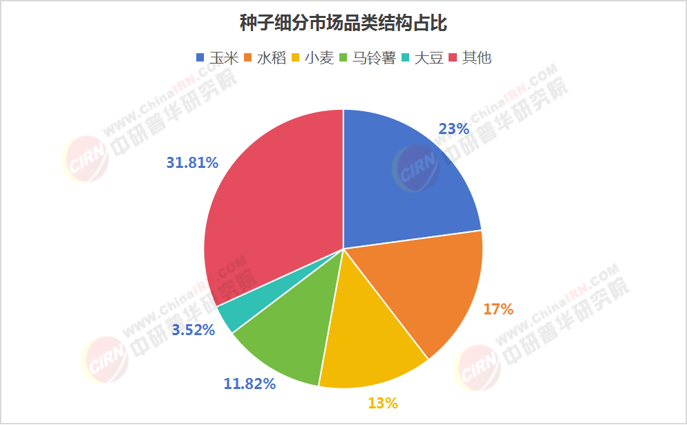 從種子市場品類結構來看,我國種業品種分布集中,主要由玉米、水稻、小麥、馬鈴薯、大豆組成。目前,我國玉米、水稻、小麥、馬鈴薯、大豆種子市值占比分別占比22.87%、16.69%、13.29%、11.82%、3.52%。