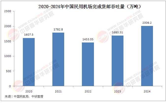貨郵吞吐量方面,2024年,年貨郵吞吐量10萬噸以上的運輸機場有34個,較上年增加3個,所完成貨郵吞吐量占全部境內運輸機場的93%。