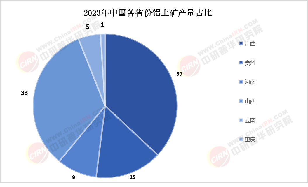 中國鋁土礦資源分布高度集中,主要集中在廣西、山西、河南和貴州四省。2023年,這四個省份的產量占比分別為37%(廣西)、33%(山西)、15%(貴州)和9%(河南),合計占全國總產量的94%。