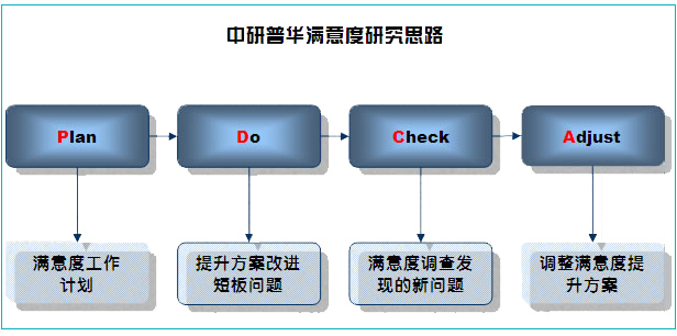 滿意度研究不僅僅能夠揭示企業(yè)目前發(fā)展中的問(wèn)題,更重要的是能夠作為企業(yè)產(chǎn)品和服務(wù)的重要依據(jù),促進(jìn)企業(yè)整體競(jìng)爭(zhēng)力的發(fā)展。在此思路指導(dǎo)之下,中研普華的滿意度研究遵循以下PDCA的四階段,在每一階段,中研普華均與客戶一起,為客戶提供從調(diào)研解讀到管理咨詢的端對(duì)端服務(wù)。