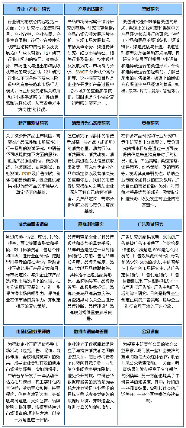中研普華是國際化的大型專業市場研究機構,我們的業務涵蓋專項市場研究、IPO咨詢、募投可研等多個領域。專項市場研究是中研普華最具競爭力的研究領域之一,我們能夠根據客戶需求提供“定制式”的市場調查服務,其中涵蓋:行業(產業)研究、產品市場調查、競爭研究、渠道研究、新產品測試研究、消費行為與態度研究、消費者調查、品牌測試研究、廣告測試研究、市場活動效果評測、數據庫調查與管理、公眾調查等。