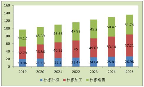 圖表:2019-2025年檸檬產(chǎn)業(yè)各細(xì)分領(lǐng)域產(chǎn)值預(yù)測(單位:億元)