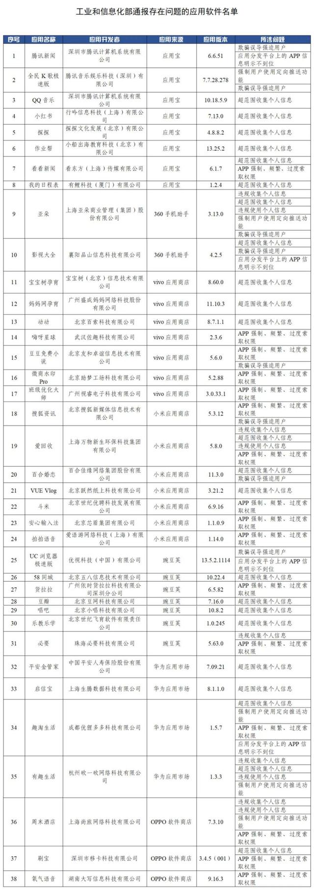 今年以來,工信部持續加大對APP侵害用戶權益的整治力度,先后三次組織對重點問題開展“回頭看”。前期,重拳整治了APP違規調用通信錄、位置信息以及彈窗信息騷擾用戶等問題。近期,針對用戶反映強烈的APP超范圍、高頻次索取權限,非服務場景所必需收集用戶個人信息,欺騙誤導用戶下載等違規行為進行了檢查,共發現38款APP(詳見附件)存在問題。上述APP應在11月9日前完成整改,逾期不整改或整改不到位的,工信部將依法依規進行處置并予以行政處罰。