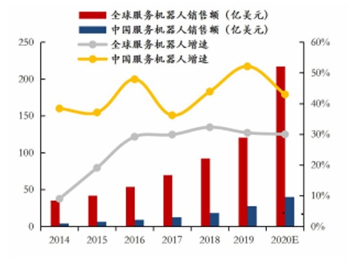 圖表:2014-2020年全球及中國服務機器人市場規模