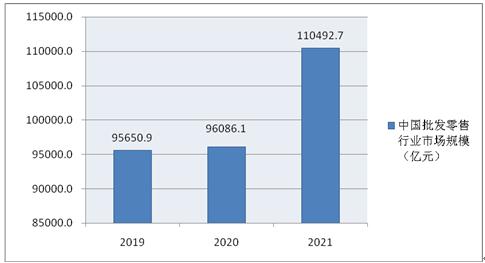 圖表:2019-2021年中國(guó)批發(fā)零售行業(yè)市場(chǎng)規(guī)模(單位:億元)