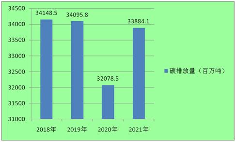 2018年全球碳排放開始下降,2018年11月歐盟通過了《歐盟2050戰略性長期愿景》,要求歐盟從能源、建筑、交通、土地利用、農業、工業、循環經濟等多方面入手,推動歐盟全面降低碳化發展。2020年全球疫情影響下,碳排放量減少5.9%,碳排放為320.79億噸。2020年中國發布“30·60” 雙碳目標的之后,日本、英國、加拿大、韓國等發達國家相繼提出到2050年前實現碳中和目標的政治承諾。日本承諾,將此前2050年目標從排放量減少80%改為實現碳中和。英國提出,在2045年實現凈零排放,2050年實現碳中和。加拿大政府也明確提出,要在2050年實現碳中和。世界主要經濟體相繼做出減少碳排放的承諾,球碳減排迎來拐點。隨著全球經濟復蘇,各國解除封鎖,2021年飆漲的天然氣價讓燃煤發電強勢復蘇,全球能源需求大幅回彈,疊加惡劣天氣、能源市場震蕩等,這些因素都推高了碳排放量。2021年碳排放量為338.84億噸,同比上漲5.6%。