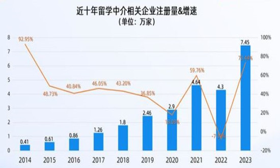 目前,市場上的留學中介機構數量眾多,服務質量參差不齊,但整體而言,行業規模持續擴大,服務對象也日益多元化。企查查數據顯示,國內現存留學中介相關企業27.23萬家。近十年相關企業注冊量呈整體顯著增長態勢,2023年全年注冊7.45萬家留學中介相關企業,同比增長73.44%,是2014年注冊量的18倍。