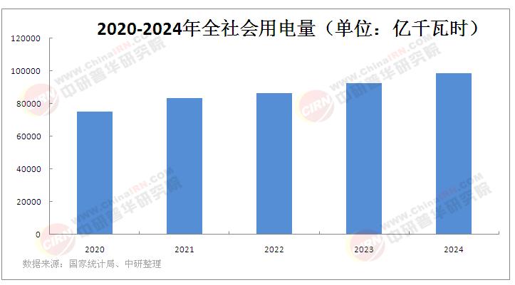 2024年,全社會用電量98521億千瓦時,同比增長6.8%,其中規模以上工業發電量為94181億千瓦時。從分產業用電看,第一產業用電量1357億千瓦時,同比增長6.3%;第二產業用電量63874億千瓦時,同比增長5.1%;第三產業用電量18348億千瓦時,同比增長9.9%;城鄉居民生活用電量14942億千瓦時,同比增長10.6%。