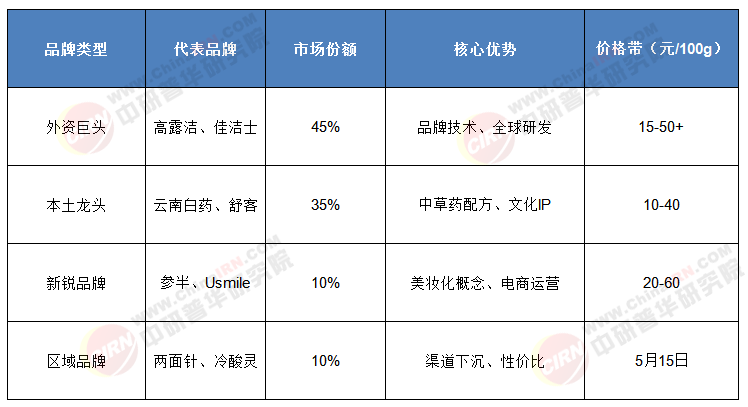 當前市場呈現“3+1”競爭格局:外資及合資品牌(高露潔、佳潔士、中華、黑人)占據65%份額;本土品牌(云南白藥、冷酸靈等)占25%;中小品牌聚焦區域低價市場。值得注意的是,國貨品牌通過差異化定位實現快速崛起,市場份額從2019年的25%提升至2024年的35%。
