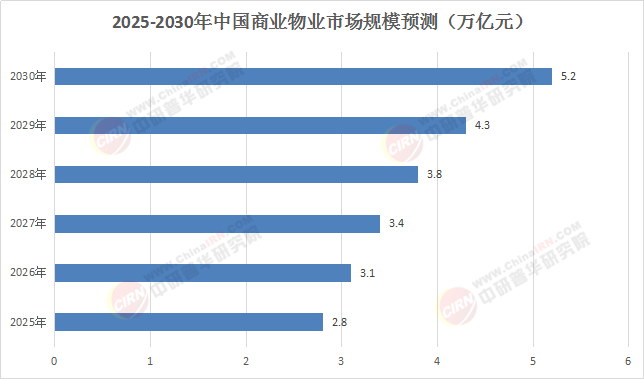總體規(guī)模:根據中研普華研究院《2025-2030年中國商業(yè)物業(yè)市場深度調研及投資前景預測研究報告》預測分析,2025年中國商業(yè)物業(yè)市場規(guī)模達2.8萬億元,同比增長9.5%,2020-2025年復合增長率達9.3%。預計2030年將突破5.2萬億元,年均復合增長率6.8%。