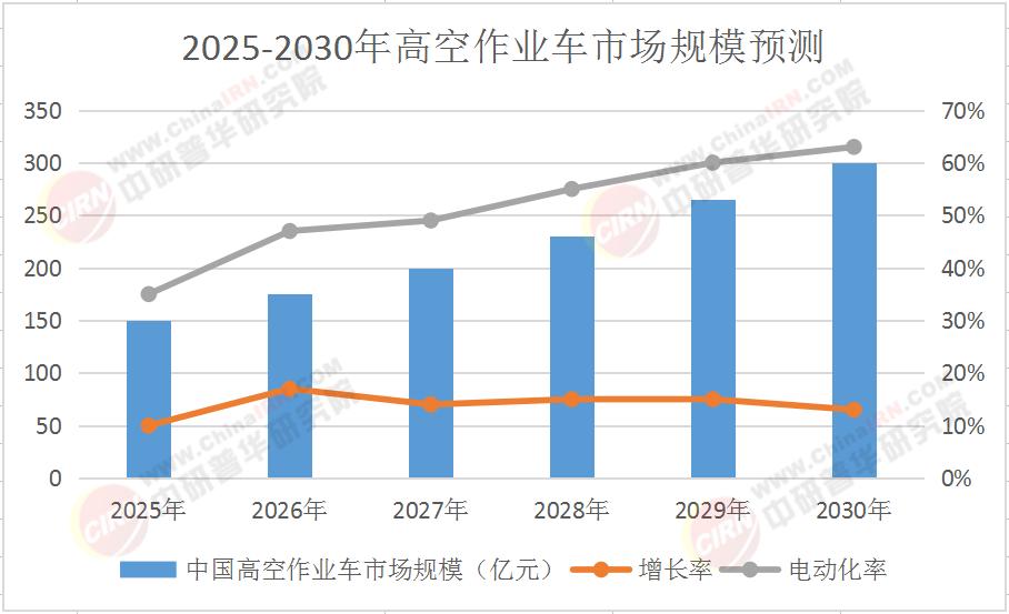 中研普華產業研究院《2025-2030年高空作業車市場發展現狀調查及供需格局分析預測報告》指出,2025-2030年,中國高空作業車市場規模將從150億元飆升至300億元,年復合增長率達15%,但行業將經歷“技術重構-需求分層-生態洗牌”三重裂變。企業若想突圍,必須讀懂三大核心邏輯:政策倒逼下的電動化轉型、場景細分引發的產品革命、全球化競爭中的生態卡位。
