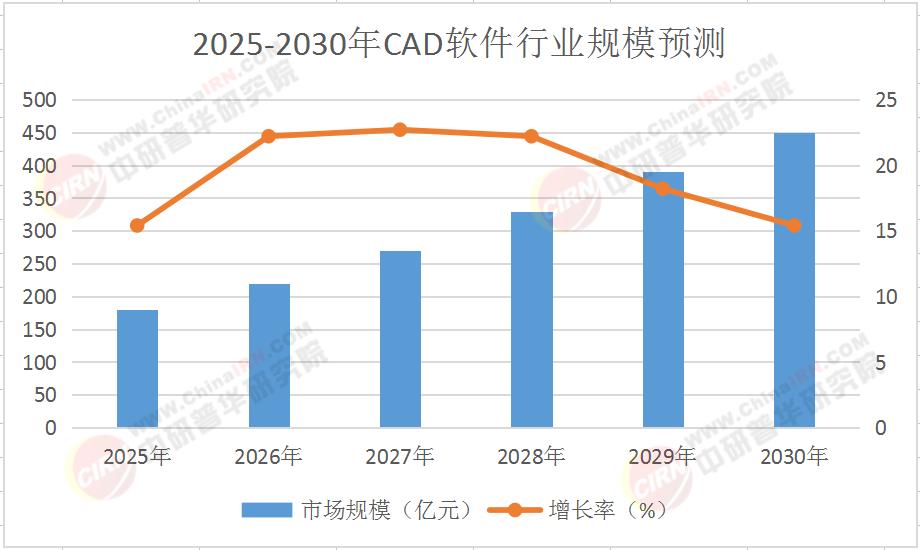 中研普華《2025-2030年CAD軟件行業市場深度分析及發展規劃咨詢綜合研究報告》預測,2025-2030年行業復合增長率將達20%,2030年市場規模有望突破450億元。