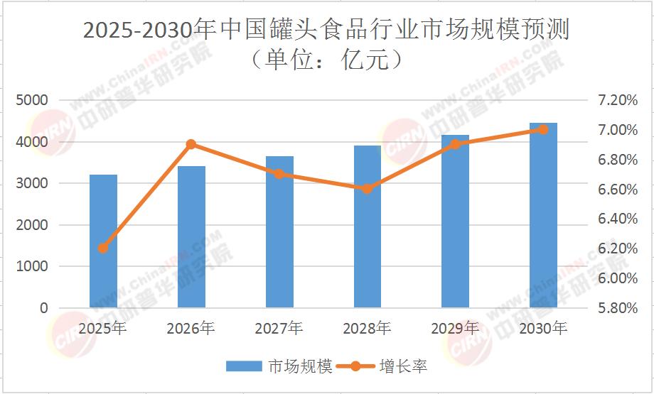 中研普華《2025-2030年中國罐頭食品行業(yè)產(chǎn)銷需求與投資風險分析報告》預測,2025年,中國罐頭食品行業(yè)市場規(guī)模預計突破3200億元,年復合增長率(CAGR)達6.2%。這一增長主要由三大動力驅(qū)動: