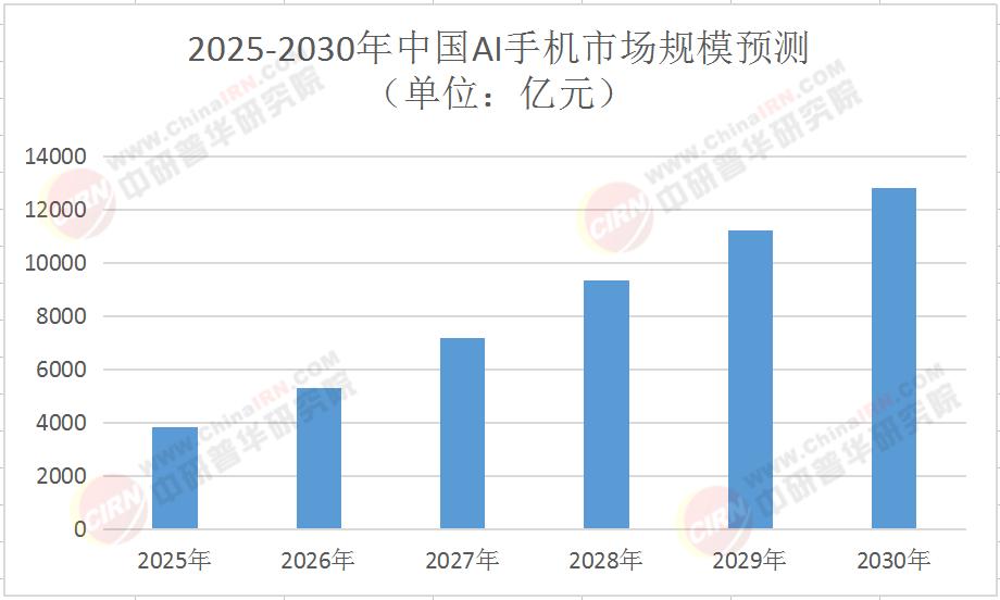 2025-2030年中國AI手機市場規模預測(單位:億元)