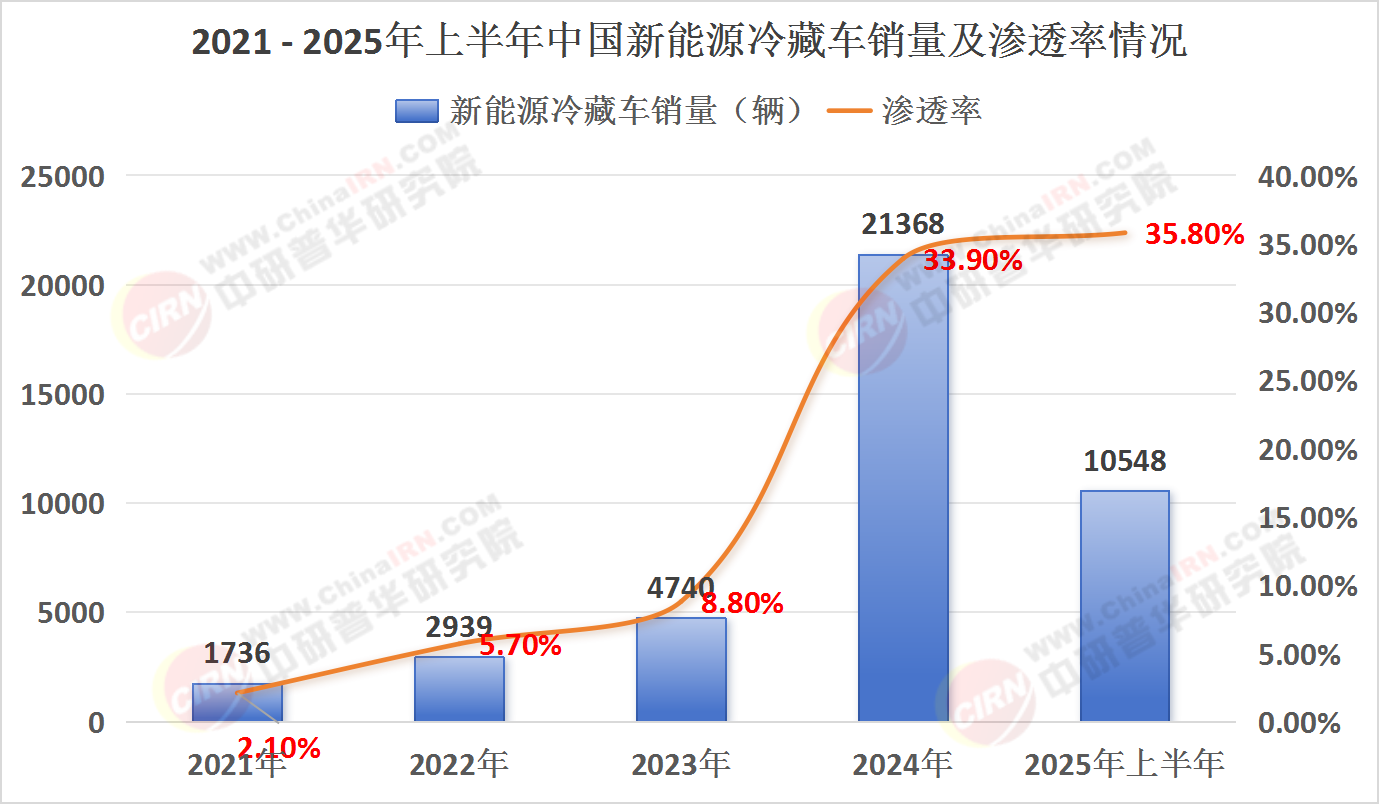 圖表:2021 - 2025年上半年中國新能源冷藏車銷量及滲透率情況