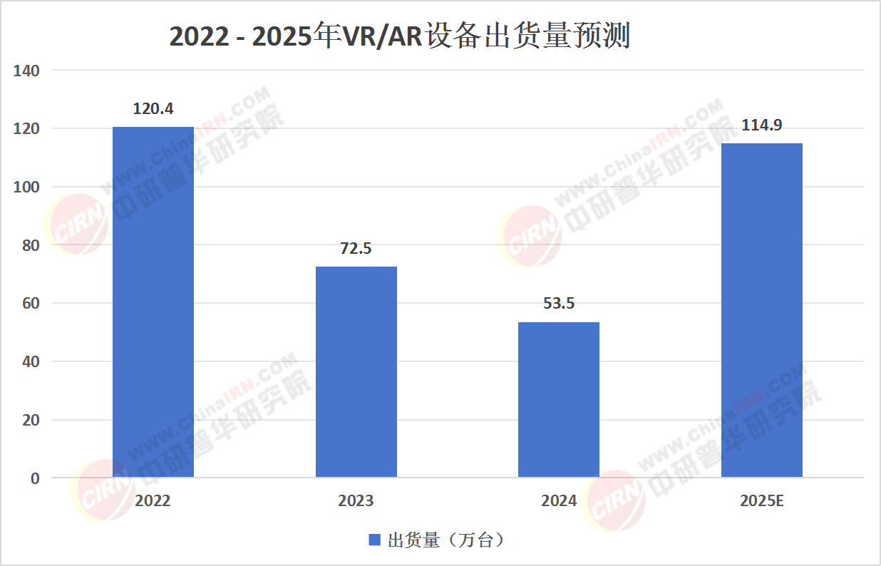 中研普華產業研究院的《2025-2030年VR產業深度調研及未來發展現狀趨勢預測報告》分析,從預測數據來看,2022 - 2025年中國VR/AR設備出貨量呈現出一定的波動。2022年出貨量處于相對較高水平,這可能得益于當時市場對VR/AR技術的熱度以及一些新產品的推出。然而,2023年和2024年出貨量有所下降,這背后可能存在多種原因。