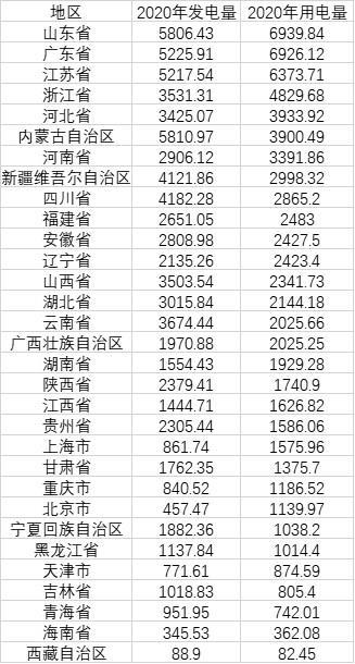 表:各地區發電、用電情況(單位:億千瓦時 來源:國家統計局)