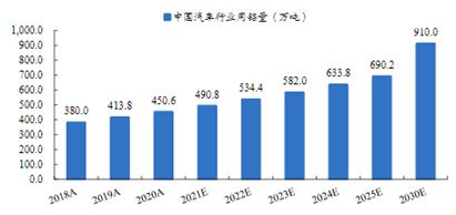圖表:2018-2030年中國(guó)汽車行業(yè)用鋁量CAGR預(yù)計(jì)為8.9%