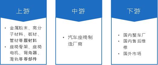 汽車座椅作為重要的汽車零部件,在整個汽車產鏈中處于承上啟下的位置,汽車座椅行業的產業鏈上游涉及金屬粉末、高分子材料、板材、管材、棒材等原材料及零部件;中游主要是華域汽車、安道拓、李爾、豐田紡織、麥格納、佛吉亞等汽車座椅制造廠商;終端應用行業為整車制造。