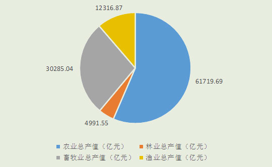 2017年中國農林牧漁總產值為114696.2億元,其中農業總產值為61719.69億元,同比增長2431.91億元,占比53.82%。